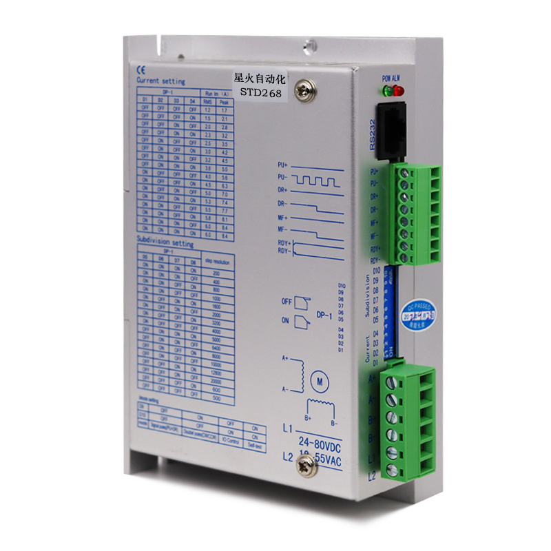 STD368M是基于DSP控制的三相步进电机驱动器。它是将先进的DSP控制芯片和独特的控制电路结合一起所构成的新一代全数字步进电机驱动器。驱动电压为DC24-80V(交流18~55V),适配电流在6.0A以下、外径57-86mm的各种型号的三相混合式步进电机。该驱动器内部采用类似伺服控制原理的电路,可以使电机运行平稳,几乎没有震动和噪音。定位精度更高可达60000脉冲/转。该产品广泛应用于雕刻机、小型数控机床、包装机械等分辨率较高的中、小型数控设备上。